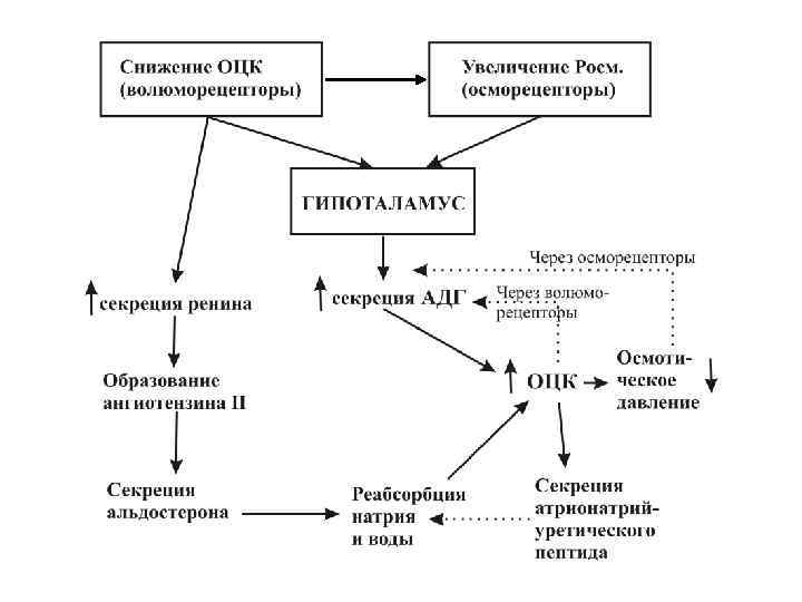 РЕЦЕПТОРЫ, УЧАСТВУЮЩИЕ В РЕГУЛЯЦИИ ПРОЦЕССОВ ВЫДЕЛЕНИЯ Осморецепторы (гипоталамус, сосуды почки, печени и др. ) Натриорецепторы (гипоталамус, сердце, стенка III жел. ГМ) Волюморецепторы (полые вены, предсердия, приносящая артериола) Увеличение Росм крови Увеличение Na+ в крови Растяжение стенок предсердий и сосудов при изменении ОЦК и АД