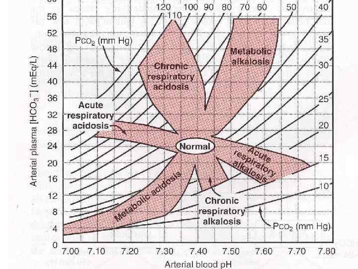 Показатели КЩР крови: 1. Концентрация ионов Н+ → р. Н = - lg [H+] 2. РСО 2 артериальной крови (в норме 40 mm. Hg, 35 -45 mm. Hg) 3. НСО 3 - : Стандартные бикарбонаты (SB) - концентрация НСО 3 - в крови при стандартных условиях (р. Н = 7, 40; Ра. СО 2 = 40 мм рт. ст. ; t = 37 °С; SO 2 = 100%). Истинные (актуальные) бикарбонаты (АВ) - концентрация НСО 3 - в крови при соответствующих конкретных условиях, имеющихся в кровеносном русле. В норме значения SB и АВ близки= 24 ± 2 ммоль/л. 4. Концентрация оснований в крови – Buffer Base (BB): в норме 48 ± 2 ммоль/л. 5. BE (BASE EXCESS) - отклонение концентрации буферных оснований от нормального уровня = 0 ± 2, 5 ммоль/л 6. Ро 2 артериальной крови (косвенный показатель) 80 -100 мм рт ст 7. Hb. О 2 / Hb