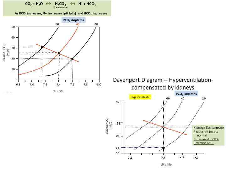 H 2 O + CO 2 H 2 CO 3 HCO 3 - + H+ Роль легких в поддержании КЩР Компенсаторная роль заключается в регуляции дыхания (гипер- или гиповентиляция легких): СО 2, р. Н => стимуляция хеморецепторов => гипервентиляция => выведение СО 2 Изменения дыхания являются быстрым механизмом регуляции КЩР (1 -2 мин. ): если р. Н гипервентиляция если р. Н гиповентиляция