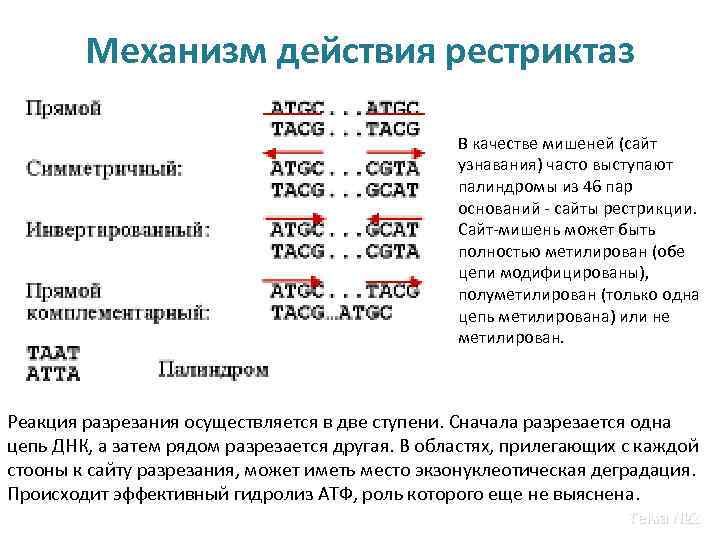 Механизм действия рестриктаз В качестве мишеней (сайт узнавания) часто выступают палиндромы из 46 пар оснований - сайты рестрикции. Сайт-мишень может быть полностью метилирован (обе цепи модифицированы), полуметилирован (только одна цепь метилирована) или не метилирован. Реакция разрезания осуществляется в две ступени. Сначала разрезается одна цепь ДНК, а затем рядом разрезается другая. В областях, прилегающих с каждой стооны к сайту разрезания, может иметь место экзонуклеотическая деградация. Происходит эффективный гидролиз АТФ, роль которого еще не выяснена. Тема № 2