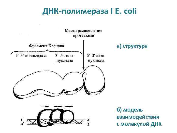 ДНК-полимераза I E. coli а) структура б) модель взаимодействия с молекулой ДНК