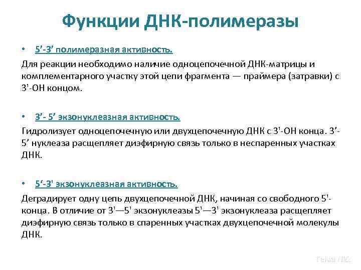 Функции ДНК-полимеразы • 5’-3’ полимеразная активность. Для реакции необходимо наличие одноцепочечной ДНК-матрицы и комплементарного участку этой цепи фрагмента — праймера (затравки) с 3'-ОН концом. • 3’- 5’ экзонуклеазная активность. Гидролизует одноцепочечную или двухцепочечную ДНК с 3'-ОН конца. 3’ 5’ нуклеаза расщепляет диэфирную связь только в неспаренных участках ДНК. • 5‘-3' экзонуклеазная активность. Деградирует одну цепь двухцепочечной ДНК, начиная со свободного 5'конца. В отличие от 3'— 5' экзонуклеазы 5'— 3' экзонуклеаза расщепляет диэфирную связь только в спаренных участках двухцепочечной молекулы ДНК. Тема № 2