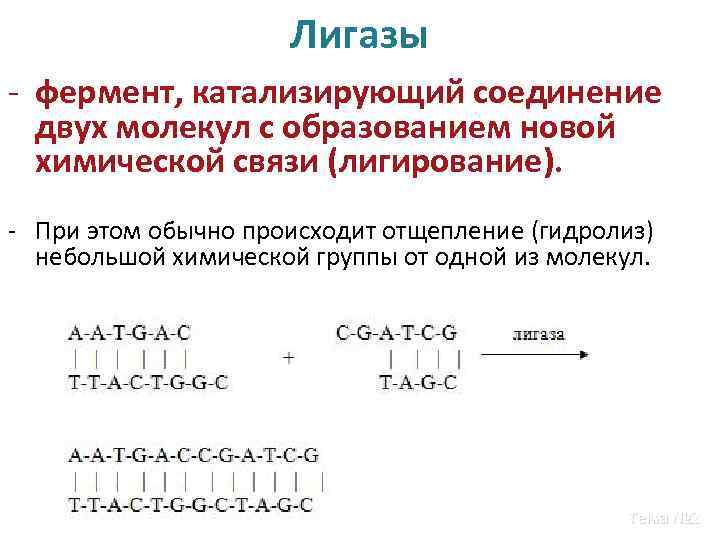 Лигазы - фермент, катализирующий соединение двух молекул с образованием новой химической связи (лигирование). - При этом обычно происходит отщепление (гидролиз) небольшой химической группы от одной из молекул. Тема № 2