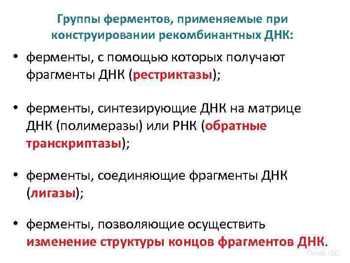 Группы ферментов, применяемые при конструировании рекомбинантных ДНК: • ферменты, с помощью которых получают фрагменты ДНК (рестриктазы); • ферменты, синтезирующие ДНК на матрице ДНК (полимеразы) или РНК (обратные транскриптазы); • ферменты, соединяющие фрагменты ДНК (лигазы); • ферменты, позволяющие осуществить изменение структуры концов фрагментов ДНК. Тема № 2