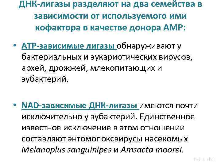 ДНК-лигазы разделяют на два семейства в зависимости от используемого ими кофактора в качестве донора AMP: • ATP-зависимые лигазы обнаруживают у бактериальных и эукариотических вирусов, архей, дрожжей, млекопитающих и эубактерий. • NAD-зависимые ДНК-лигазы имеются почти исключительно у эубактерий. Единственное известное исключение в этом отношении составляют энтомопоксвирусы насекомых Melanoplus sanguinipes и Amsacta moorei. Тема № 2