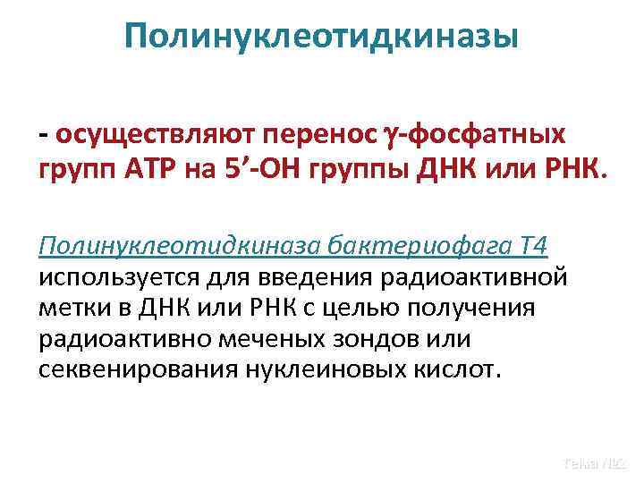 Полинуклеотидкиназы - осуществляют перенос -фосфатных групп ATP на 5’-OH группы ДНК или РНК. Полинуклеотидкиназа бактериофага Т 4 используется для введения радиоактивной метки в ДНК или РНК с целью получения радиоактивно меченых зондов или секвенирования нуклеиновых кислот. Тема № 2