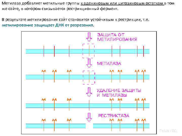 Метилаза добавляет метильные группы к адениновым или цитозиновым остаткам в том же сайте, в котором связывается рестрикционный фермент. В результате метилирования сайт становится устойчивым к рестрикции, т. е. метилирование защищает ДНК от разрезания. Тема № 2
