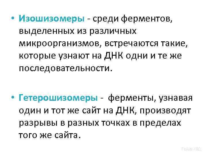 • Изошизомеры - среди ферментов, выделенных из различных микроорганизмов, встречаются такие, которые узнают на ДНК одни и те же последовательности. • Гетерошизомеры - ферменты, узнавая один и тот же сайт на ДНК, производят разрывы в разных точках в пределах того же сайта. Тема № 2