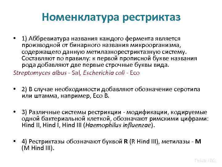 Номенклатура рестриктаз • 1) Аббревиатура названия каждого фермента является производной от бинарного названия микроорганизма, содержащего данную метилазнорестриктазную систему. Составляют по правилу: к первой прописной букве названия рода добавляют две первые строчные буквы вида. Streptomyces albus - Sal, Escherichia coli - Eco • 2) В случае необходимости добавляют обозначение серотипа или штамма, например, Есо B. • 3) Различные системы рестрикции - модификации, кодируемые одной бактериальной клеткой, обозначают римскими цифрами: Hind II, Hind III (Haemophilus influenzae). • 4) Рестриктазы обозначают буквой R (R Hind III), метилазы - М (М Hind III). Тема № 2