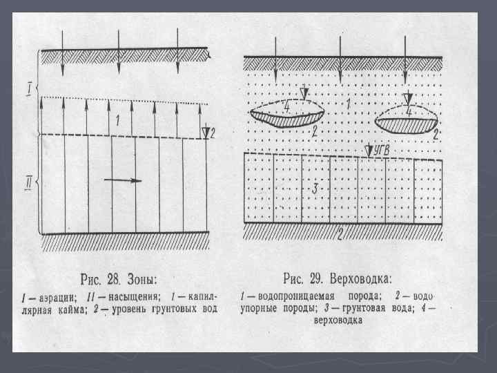 4. Классификация подземных вод по условиям залегания: ► 1. Зона аэрации: ► 1. 1. верховодка ► 2. зона полного насыщения водой: ► 2. 1 грунтовые воды ► 2. 2. межпластовые воды: ► 2. 2. а - ненапорные ► 2. 2. б – напорные (артезианские)