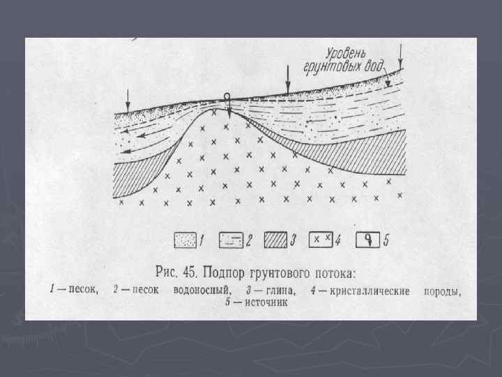 Типы подземных вод по условиям залегания 1 –водопроницаемые Г. породы 2 - водоупорные Г. породы 3 – УГВ 4 –пьезометрический уровень (уровень поднятия напорных вод при их полном вскрытии) 5 - скважины