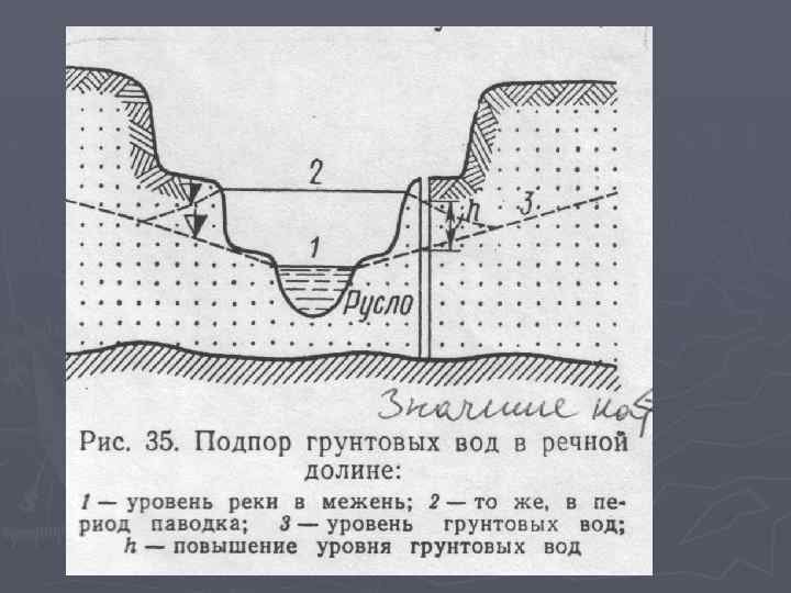 Антропогенные факторы: ► обводнение, осушение и орошение территорий, ► подпор со стороны водохранилища, ► водоотлив при строительстве, ► сброс промышленных и бытовых вод, ► водоотлив из горных выработок и др.