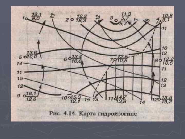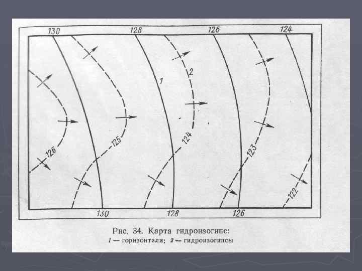 Карты поверхности грунтовых вод (карты гидроизогипс) Для выявления характера поверхности (зеркала) ГВ составляют карты гидроизогипс (рис. 34). Гидроизогипсы - линии, соединяющие точки с одинаковыми абсолютными или относительными отметками уровней ГВ. Эти линий аналогичны горизонталям рельефа местности и подобно им отражают рельеф зеркала вод. ► Форма поверхности грунтовых вод сложная и зависит от многих факторов: состава водовмещающих пород и их водопроницаемости, рельефа, условий залегания и дренирования. Карты гидроизогипс необходимы при решении многих задач, связанных с проектированием водозаборов подземных вод, борьбой с подтоплением территории и др. ► Для построения карты гидроизогипс замеряют уровни грунтовых вод в скважинах, расположенных обычно по сетке. Замеры уровней воды должны быть единовременными. Абсолютные отметки уровня подземных вод в скважинах определяют по формуле ►