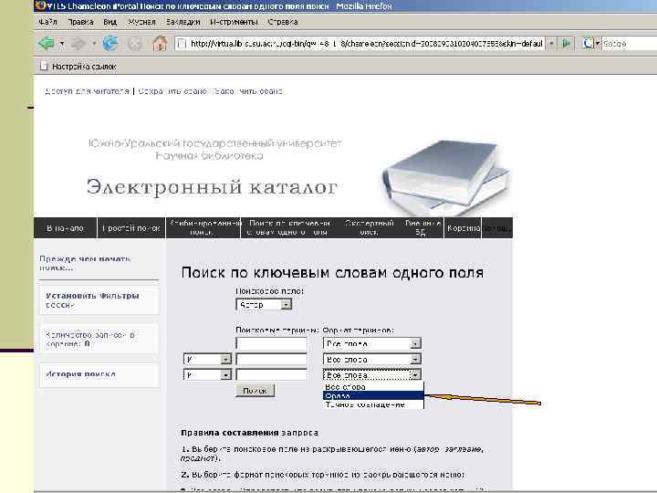 Поисковые поля в экспертном виде поиска заменяются буквенными обозначениями на английском языке: n n n n a - Автор anc - Коллективный автор t - Заглавие tse - Серия date - Год издания ed - Поступления период (за год/ месяц/число) s - Предмет k - Вид издания kp - Вид периодического издания p - Издательство lс - Каталожный шифр УДК, ББК nls - Полочный шифр ps - Место хранения de - Электронный документ hi - Сведения об источнике, для статей Aw - Все поля, проиндексированные для поиска