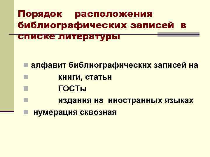 Порядок расположения библиографических записей в списке литературы n алфавит библиографических записей на n книги, статьи n ГОСТы n издания на иностранных языках n нумерация сквозная