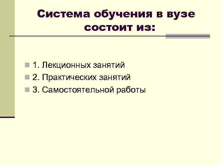 Система обучения в вузе состоит из: n 1. Лекционных занятий n 2. Практических занятий n 3. Самостоятельной работы