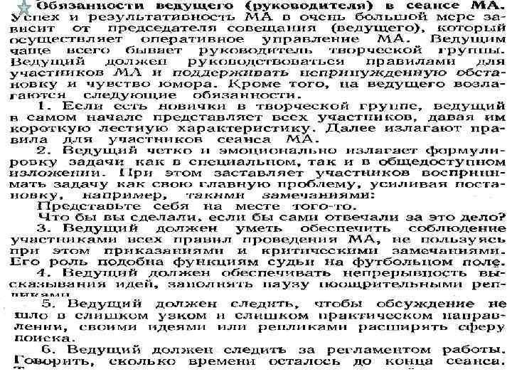 МЕТОД КОНТРОЛЬНЫХ ВОПРОСОВ • Метод контрольных вопросов применяется для психологической активизации творческого процесса. Цель его с помощью наводящих вопросов подвести к решению задачи. Списки таких вопросов предлагались различными авторами с 20 х годов нашего столетия. Метод может применяться либо в форме монолога изобретателя, обращенного к самому себе, либо диалога, например, в виде вопросов, задаваемых руководителем мозгового штурма. Суть метода состоит в том, что изобретатель отвечает на вопросы, содержащиеся в списке, и в связи с ними рассматривает свою задачу. Широко распространены универсальные вопросники, составленные А. Осборном, Э. Раудзенпом, Т. Эйлоартом, Д. Пирсоном и др. Они состоят из различного количества вопросов. За рубежом чаще пользуются вопросником, разработанным А. Осборном, который содержит 9 групп вопросов.