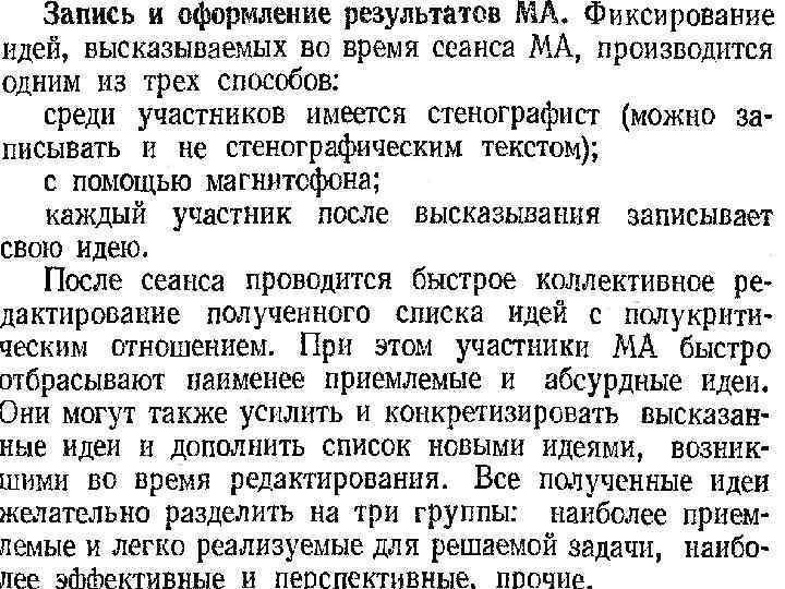 Список контрольных вопросов по Т. Эйлоарту (продолжение) 11. Спать с проблемой, идти на работу, гулять, принимать душ, ехать, пить, есть, играть в теннис— все с ней. 12. Бродить среди стимулирующей обстановки (свалка лома, технические музеи, магазины дешевых вещей), пробегать журналы, комиксы. 13. Набросать таблицу цен, величин, перемещений, типов материалов и т. д. разных решений проблемы или ее частей, искать проблемы в решениях или новые комбинации. 14. Определить идеальное решение, разрабатывать возможные. 15. Видоизменить решение проблемы с точки зрения времени (скорее или медленнее), размеров, вязкости и т. п. 16. В воображении залезть внутрь механизма. 17. Определить альтернативные проблемы и системы, которые изымают определенное звено из цепи и, таким образом, создают нечто совершенно иное, уводя в сторону от нужного решения. 18. Чья это проблема? Почему его? 19. Кто придумал это первый? История вопроса. Какие ложные толкования этой проблемы имели место? 20. Кто еще решил эту проблему? Чего он добился? 21. Определить общепринятые граничные условия и причины их установления.