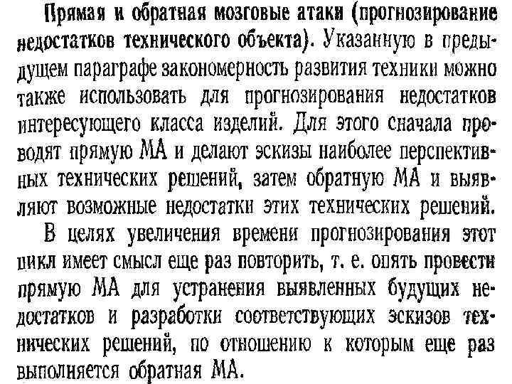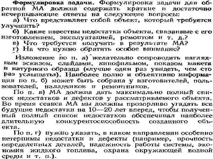 Список контрольных вопросов по А. Осборну (продолжение) 5. Что можно в техническом объекте уменьшить? Что можно заменить? Можно ли что нибудь уплотнить, сжать, сгустить, конденсировать, применить способ миниатюризации, укоротить, сузить, отделить, раздробить? 6. Что можно в техническом объекте заменить? Что, сколько замешать и с чем? Другой ингредиент? Другой материал? Другой процесс? Другой источник энергии? Другое расположение? Другой цвет, звук, освещение? 7. Что можно преобразовать в техническом объекте? Какие компоненты можно взаимно заменить? Изменить модель? Изменить разбивку, разметку, планировку? Изменить последовательность операций? Транспонировать причину и эффект? Изменить скорость или темп? Изменить режим? 8. Что можно в техническом объекте перевернуть наоборот? Транспонировать положительное и отрицательное. Нельзя ли обменять местами противоположно размещенные элементы? Повернуть их задом наперед? Перевернуть низом вверх? Обменять местами? Поменять ролями? Перевернуть зажимы? 9. Какие новые комбинации элементов технического объекта, возможны? Можно ли создать смесь, сплав, новый ассортимент, гарнитур? Комбинировать секции, узлы, блоки, агрегаты? Комбинировать цели? Комбинировать привлекательные признаки? Комбинировать идеи?