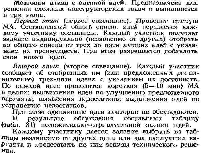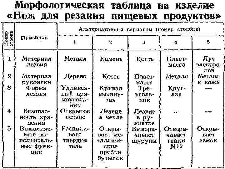 4. Определение функциональной ценности всех полученных вариантов решений. Это наиболее ответственный этап метода. Чтобы не запутаться в огромном числе решений и деталей, оценка их характеристик должна проводиться на универсальной и, по возможности, простой основе, хотя это не всегда легкая задача. Должны быть рассмотрены все N вариантов решений, вытекающих из структуры морфологической таблицы, и проведено их сравнение по одному или нескольким наиболее важным для данной технической системы показателям. 5. Выбор наиболее рациональных конкретных решений. Нахождение оптимального варианта может осуществляться по лучшему значению наиболее важного показателя технической системы. Морфологический анализ создает основу для системного мышления в категориях основных структурных признаков, принципов и параметров, что и обеспечивает высокую эффективность его применения. Он является упорядоченным способом исследования, позволяющим добиться систематического обзора всех возможных решений данной крупномасштабной проблемы. Метод строит мышление таким образом, что генерируется новая информация, касающаяся тех комбинаций, которые при бессистемной деятельности воображения ускользают от внимания. Хотя морфологическому образу мышления внутренне присуще убеждение, что все решения могут быть реализованы, при этом, естественно, многие из них оказываются сравнительно тривиальными. Трудность применения морфологического анализа заключается в том, что до сих пор не существует какого либо действительно практического и универсального метода оценки эффективности того или иного варианта решения. Чаще всего, конечно, оказывается, что рабочие характеристики устройства, в основу построения которого положена неизвестная ранее комбинация элементов, являются более или менее неопределенными.