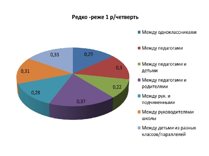 Конфликты между педагогами и родителями: • С точки зрения учителей частота столкновений здесь гораздо ниже, чем с детьми: лишь 18% отметили, что они бывают чаще 1 р/м (10% детей ответили также); от 1 р/м до 1 р/ч отметили 44% опрошенных учителей и 17% детей. • Можно предположить, что это та часть «айсберга» конфликтных ситуаций, о которых дети в своих анкетах в продолжение предложения «Родители могут предотвратить некоторые конфликты своих детей, если…» писали: «если бы те рассказывали о своей школьной жизни и об этих конфликтах» .