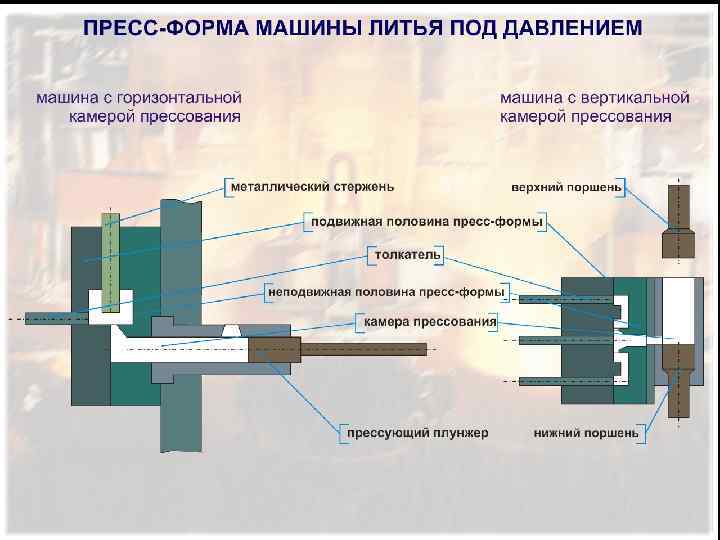 ЛИТЬЕ ПОД ДАВЛЕНИЕМ Основной принцип литья под давлением заключается в том, что металл заполняет форму принудительно под поршневым или газовым давлением. К основным преимуществам литья под давлением относятся: -высокая производительность; -высокая точность отливок и очень хорошее качество их поверхности. К недостаткам литья под давлением относятся: -ЛПД не используется для получения крупных отливок (до 100 кг); -не всякая конструкция отливки пригодна для ЛПД.