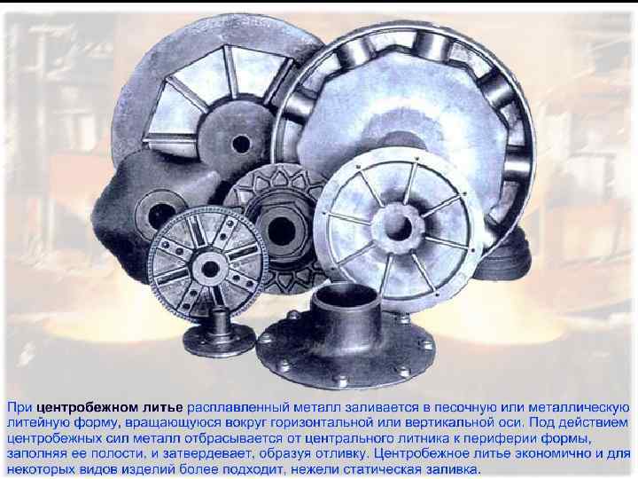 ЦЕНТРОБЕЖНОЕ ЛИТЬЕ Центробежное литье основано на использовании центробежной силы, которая создается при вращении литейной формы вокруг своей оси. Существует две разновидности – с горизонтальными или вертикальными осями вращения формы. Формы с горизонтальной осью вращения обеспечивают получение отливок с толщиной стенок, одинаковой по всей длине; они применяются для получения протяжных деталей: водопроводные трубы, гильзы двигателей и др. Формы с вертикальной осью вращения используются для изготовления отливок типа колец, дисков и втулок подшипников трения. К основным преимуществам ЦЛ относятся: -повышение производительности труда в 1, 5… 5 раз; -отпадает необходимость использовать стержень; -повышение качества металла; -улучшение условий труда. Ограничение области использования ЦЛ: метод применяется в основном для получения отливок тел вращения.