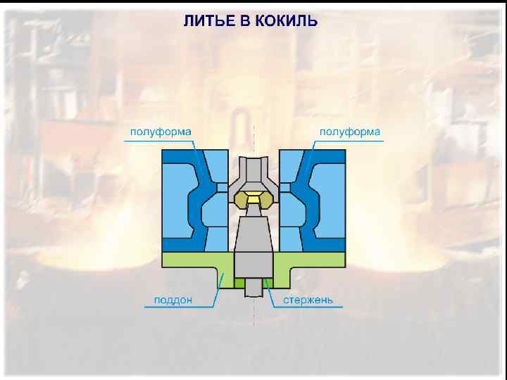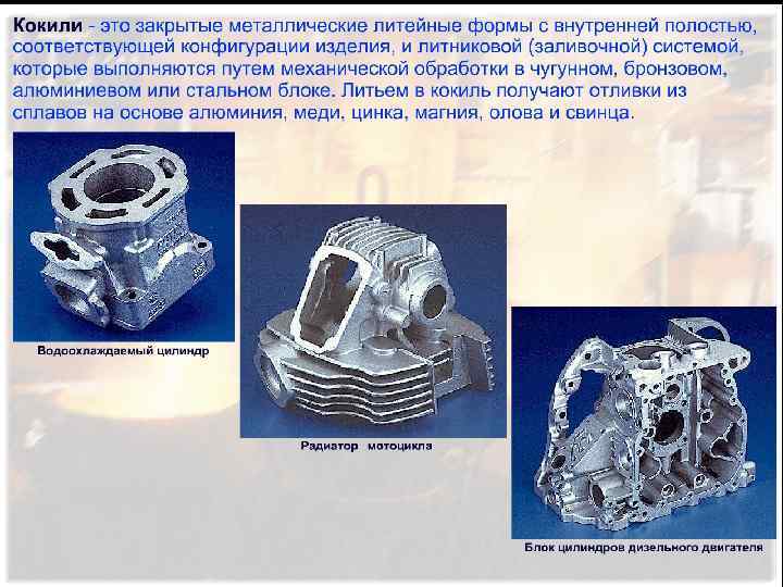 ЛИТЬЕ В КОКИЛЬ Кокиль – это металлическая форма, которая заполняется металлом без приложения давления. Кокили могут состоять из одной, двух или нескольких полуформ; кокили с несколькими плоскостями разъема применяются для изготовления сложных по конфигурации отливок (блок-картеров, головка блока и др. ). К основным преимуществам литья в кокиль относятся: -повышение производительности труда; -улучшение условий труда рабочих; -повышение качества отливок (повышается твёрдость и прочность). К недостатком литья в кокиль можно отнести: -ограничения в получении чугунных и стальных отливок по массе и конструкции; -высокую стоимость металлической формы.