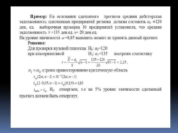 Задача проверки статистической гипотезы состоит в том, чтобы, используя статистические данные (выборку) X 1, X 2, …, Xn, принять или отклонить нулевую гипотезу 26