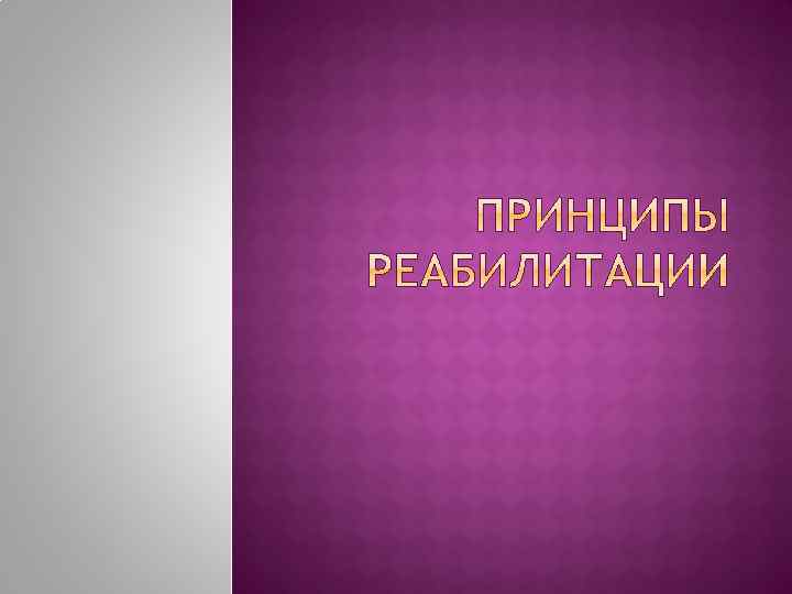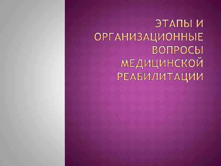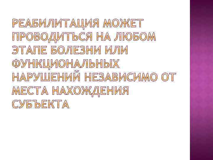 Реактивация (восстановление функции) Ресоциализация Реинтеграция (восстановление социального и психостатуса) РЕАБИЛИТАНТ – человек, которому показаны реабилитационные мероприятия.