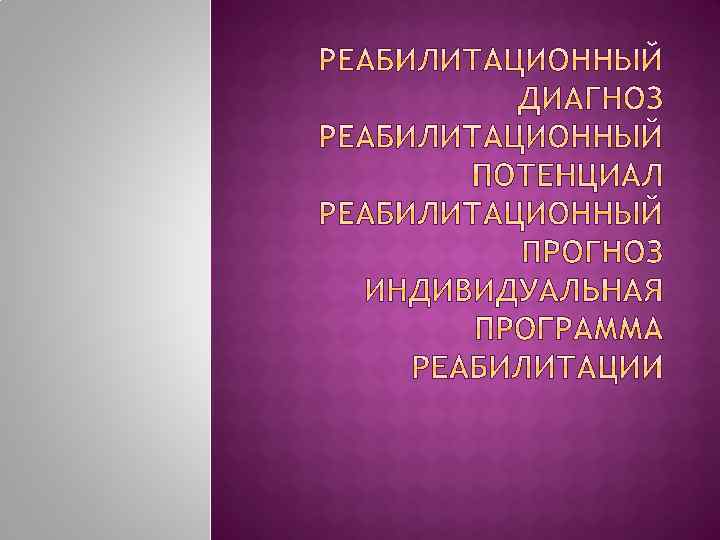 Это медицински обоснованная вероятность достижения намеченных целей реабилитации в намеченный отрезок времени. РП зависит от Ø Характера заболевания Ø Степени выраженности ограничений жизнедеятельности Ø Компенсаторных возможностей организма Ø Предполагаемого влияния внешних факторов РП оценивается как высокий, удовлетворительный, низкий, отсутствие.