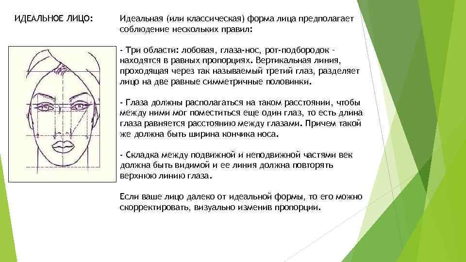 ИДЕАЛЬНОЕ ЛИЦО: Идеальная (или классическая) форма лица предполагает соблюдение нескольких правил: - Три области: лобовая, глаза-нос, рот-подбородок – находятся в равных пропорциях. Вертикальная линия, проходящая через так называемый третий глаз, разделяет лицо на две равные симметричные половинки. - Глаза должны располагаться на таком расстоянии, чтобы между ними мог поместиться еще один глаз, то есть длина глаза равняется расстоянию между глазами. Причем такой же должна быть ширина кончика носа. - Складка между подвижной и неподвижной частями век должна быть видимой и ее линия должна повторять верхнюю линию глаза. Если ваше лицо далеко от идеальной формы, то его можно скорректировать, визуально изменив пропорции.