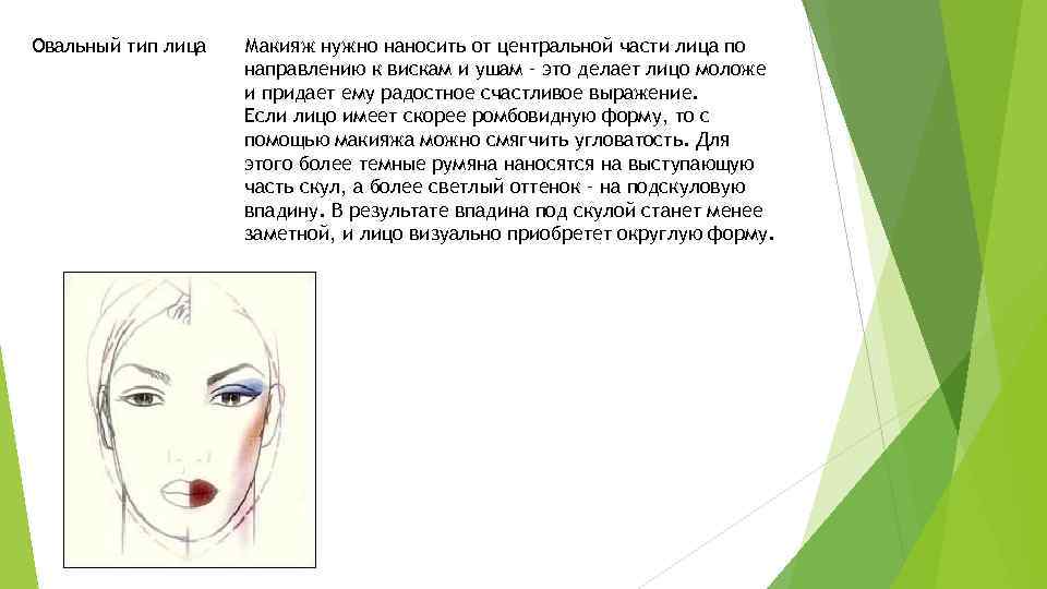 Овальный тип лица Макияж нужно наносить от центральной части лица по направлению к вискам и ушам – это делает лицо моложе и придает ему радостное счастливое выражение. Если лицо имеет скорее ромбовидную форму, то с помощью макияжа можно смягчить угловатость. Для этого более темные румяна наносятся на выступающую часть скул, а более светлый оттенок – на подскуловую впадину. В результате впадина под скулой станет менее заметной, и лицо визуально приобретет округлую форму.