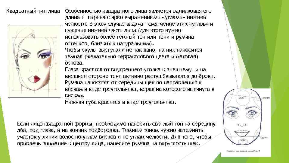 Квадратный тип лица Особенностью квадратного лица является одинаковая его длина и ширина с ярко выраженными «углами» нижней челюсти. В этом случае задача – смягчение этих «углов» и сужение нижней части лица (для этого нужно использовать более темный тон или тени и румяна оттенков, близких к натуральным). Чтобы скулы выступали не так явно, на них наносится темная (желательно терракотового цвета и матовая) основа. Глаза красятся от внутреннего уголка к внешнему, и на внешней стороне тени активно растушёвываются до брови. Румяна наносятся от середины щек по направлению к вискам в виде треугольника, вершина которого вытянута к вискам. Нижняя губа красится в виде треугольника. Если лицо квадратной формы, необходимо наносить светлый тон на середину лба, под глаза, и на кончик подбородка. Темным тоном нужно затемнить участок у линии волос по углам висков и по углам челюсти. Для того, чтобы привлечь внимание к центру лица, нанесите румяна на округлость щек.