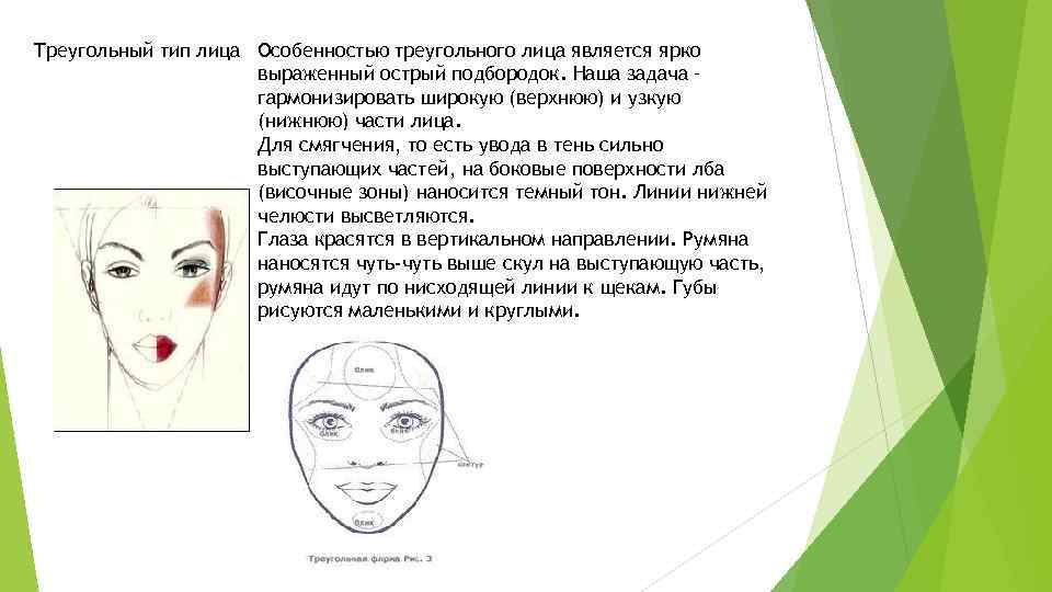 Треугольный тип лица Особенностью треугольного лица является ярко выраженный острый подбородок. Наша задача – гармонизировать широкую (верхнюю) и узкую (нижнюю) части лица. Для смягчения, то есть увода в тень сильно выступающих частей, на боковые поверхности лба (височные зоны) наносится темный тон. Линии нижней челюсти высветляются. Глаза красятся в вертикальном направлении. Румяна наносятся чуть-чуть выше скул на выступающую часть, румяна идут по нисходящей линии к щекам. Губы рисуются маленькими и круглыми.