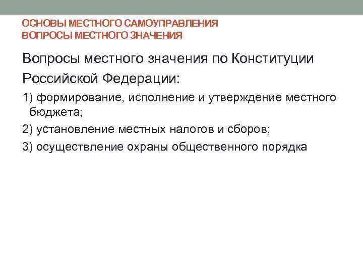 ОСНОВЫ МЕСТНОГО САМОУПРАВЛЕНИЯ ВОПРОСЫ МЕСТНОГО ЗНАЧЕНИЯ Вопросы местного значения по Конституции Российской Федерации: 1) формирование, исполнение и утверждение местного бюджета; 2) установление местных налогов и сборов; 3) осуществление охраны общественного порядка