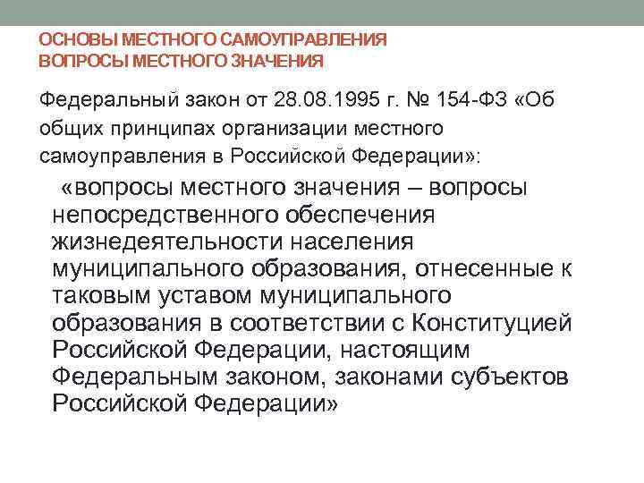 ОСНОВЫ МЕСТНОГО САМОУПРАВЛЕНИЯ ВОПРОСЫ МЕСТНОГО ЗНАЧЕНИЯ Федеральный закон от 28. 08. 1995 г. № 154 -ФЗ «Об общих принципах организации местного самоуправления в Российской Федерации» : «вопросы местного значения – вопросы непосредственного обеспечения жизнедеятельности населения муниципального образования, отнесенные к таковым уставом муниципального образования в соответствии с Конституцией Российской Федерации, настоящим Федеральным законом, законами субъектов Российской Федерации»