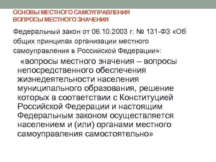 ОСНОВЫ МЕСТНОГО САМОУПРАВЛЕНИЯ ВОПРОСЫ МЕСТНОГО ЗНАЧЕНИЯ Федеральный закон от 06. 10. 2003 г. № 131 -ФЗ «Об общих принципах организации местного самоуправления в Российской Федерации» : «вопросы местного значения – вопросы непосредственного обеспечения жизнедеятельности населения муниципального образования, решение которых в соответствии с Конституцией Российской Федерации и настоящим Федеральным законом осуществляется населением и (или) органами местного самоуправления самостоятельно»