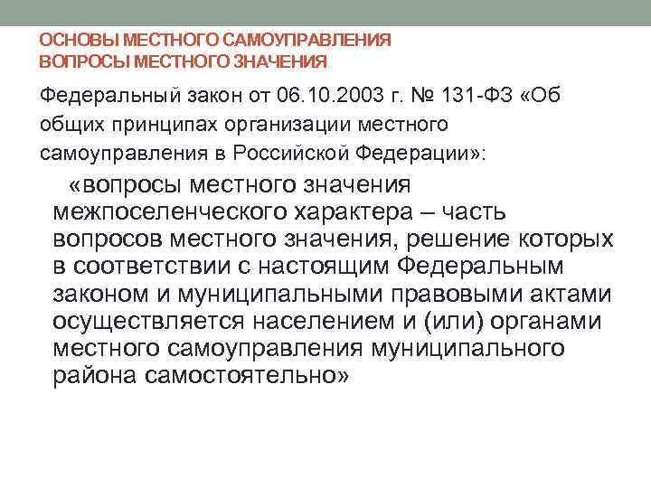 ОСНОВЫ МЕСТНОГО САМОУПРАВЛЕНИЯ ВОПРОСЫ МЕСТНОГО ЗНАЧЕНИЯ Федеральный закон от 06. 10. 2003 г. № 131 -ФЗ «Об общих принципах организации местного самоуправления в Российской Федерации» : «вопросы местного значения межпоселенческого характера – часть вопросов местного значения, решение которых в соответствии с настоящим Федеральным законом и муниципальными правовыми актами осуществляется населением и (или) органами местного самоуправления муниципального района самостоятельно»
