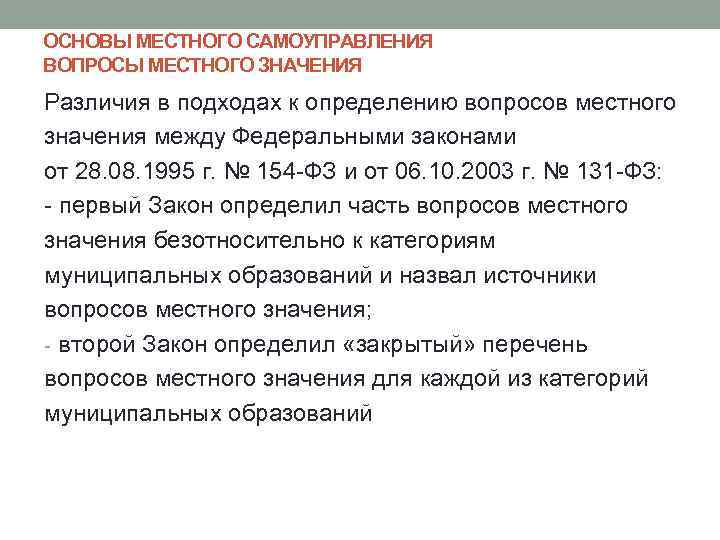 ОСНОВЫ МЕСТНОГО САМОУПРАВЛЕНИЯ ВОПРОСЫ МЕСТНОГО ЗНАЧЕНИЯ Различия в подходах к определению вопросов местного значения между Федеральными законами от 28. 08. 1995 г. № 154 -ФЗ и от 06. 10. 2003 г. № 131 -ФЗ: - первый Закон определил часть вопросов местного значения безотносительно к категориям муниципальных образований и назвал источники вопросов местного значения; - второй Закон определил «закрытый» перечень вопросов местного значения для каждой из категорий муниципальных образований