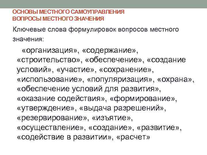 ОСНОВЫ МЕСТНОГО САМОУПРАВЛЕНИЯ ВОПРОСЫ МЕСТНОГО ЗНАЧЕНИЯ Ключевые слова формулировок вопросов местного значения: «организация» , «содержание» , «строительство» , «обеспечение» , «создание условий» , «участие» , «сохранение» , «использование» , «популяризация» , «охрана» , «обеспечение условий для развития» , «оказание содействия» , «формирование» , «утверждение» , «выдача разрешений» , «резервирование» , «изъятие» , «осуществление» , «создание» , «развитие» , «содействие в развитии» , «расчет»