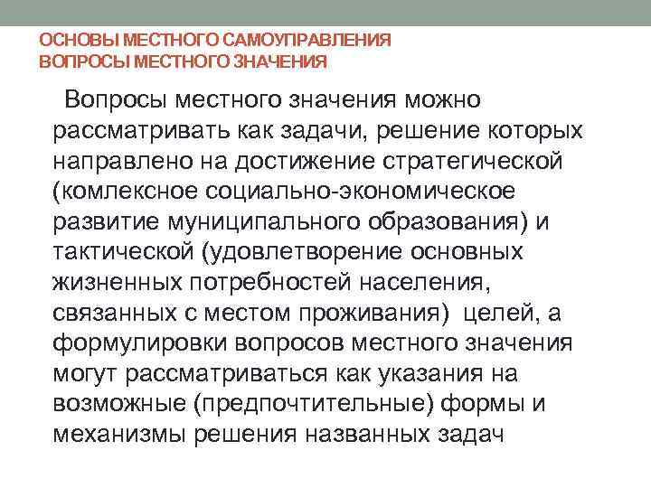 ОСНОВЫ МЕСТНОГО САМОУПРАВЛЕНИЯ ВОПРОСЫ МЕСТНОГО ЗНАЧЕНИЯ Вопросы местного значения можно рассматривать как задачи, решение которых направлено на достижение стратегической (комлексное социально-экономическое развитие муниципального образования) и тактической (удовлетворение основных жизненных потребностей населения, связанных с местом проживания) целей, а формулировки вопросов местного значения могут рассматриваться как указания на возможные (предпочтительные) формы и механизмы решения названных задач