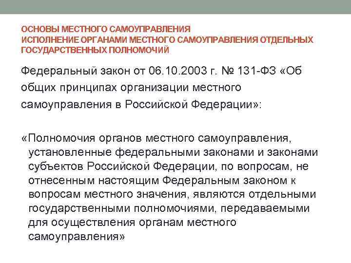 ОСНОВЫ МЕСТНОГО САМОУПРАВЛЕНИЯ ИСПОЛНЕНИЕ ОРГАНАМИ МЕСТНОГО САМОУПРАВЛЕНИЯ ОТДЕЛЬНЫХ ГОСУДАРСТВЕННЫХ ПОЛНОМОЧИЙ Федеральный закон от 06. 10. 2003 г. № 131 -ФЗ «Об общих принципах организации местного самоуправления в Российской Федерации» : «Полномочия органов местного самоуправления, установленные федеральными законами субъектов Российской Федерации, по вопросам, не отнесенным настоящим Федеральным законом к вопросам местного значения, являются отдельными государственными полномочиями, передаваемыми для осуществления органам местного самоуправления»