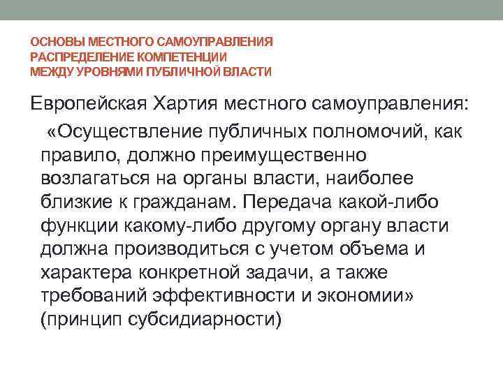 ОСНОВЫ МЕСТНОГО САМОУПРАВЛЕНИЯ РАСПРЕДЕЛЕНИЕ КОМПЕТЕНЦИИ МЕЖДУ УРОВНЯМИ ПУБЛИЧНОЙ ВЛАСТИ Европейская Хартия местного самоуправления: «Осуществление публичных полномочий, как правило, должно преимущественно возлагаться на органы власти, наиболее близкие к гражданам. Передача какой-либо функции какому-либо другому органу власти должна производиться с учетом объема и характера конкретной задачи, а также требований эффективности и экономии» (принцип субсидиарности)