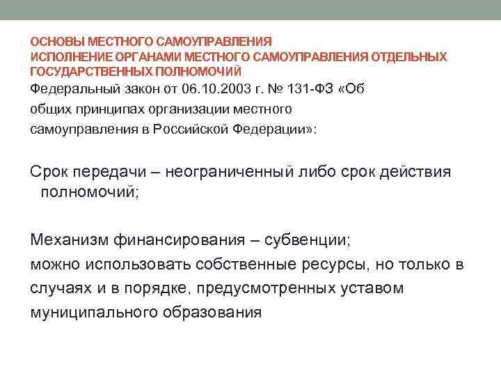ОСНОВЫ МЕСТНОГО САМОУПРАВЛЕНИЯ ИСПОЛНЕНИЕ ОРГАНАМИ МЕСТНОГО САМОУПРАВЛЕНИЯ ОТДЕЛЬНЫХ ГОСУДАРСТВЕННЫХ ПОЛНОМОЧИЙ Федеральный закон от 06. 10. 2003 г. № 131 -ФЗ «Об общих принципах организации местного самоуправления в Российской Федерации» : Срок передачи – неограниченный либо срок действия полномочий; Механизм финансирования – субвенции; можно использовать собственные ресурсы, но только в случаях и в порядке, предусмотренных уставом муниципального образования