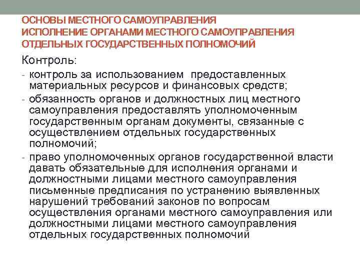 ОСНОВЫ МЕСТНОГО САМОУПРАВЛЕНИЯ ИСПОЛНЕНИЕ ОРГАНАМИ МЕСТНОГО САМОУПРАВЛЕНИЯ ОТДЕЛЬНЫХ ГОСУДАРСТВЕННЫХ ПОЛНОМОЧИЙ Контроль: - контроль за использованием предоставленных материальных ресурсов и финансовых средств; - обязанность органов и должностных лиц местного самоуправления предоставлять уполномоченным государственным органам документы, связанные с осуществлением отдельных государственных полномочий; - право уполномоченных органов государственной власти давать обязательные для исполнения органами и должностными лицами местного самоуправления письменные предписания по устранению выявленных нарушений требований законов по вопросам осуществления органами местного самоуправления или должностными лицами местного самоуправления отдельных государственных полномочий
