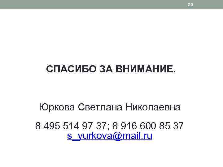 26 СПАСИБО ЗА ВНИМАНИЕ. Юркова Светлана Николаевна 8 495 514 97 37; 8 916 600 85 37 s_yurkova@mail. ru