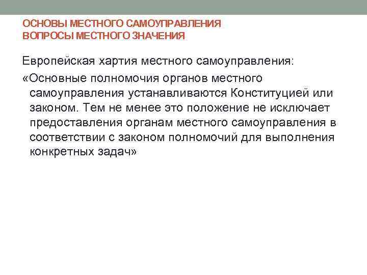 ОСНОВЫ МЕСТНОГО САМОУПРАВЛЕНИЯ ВОПРОСЫ МЕСТНОГО ЗНАЧЕНИЯ Европейская хартия местного самоуправления: «Основные полномочия органов местного самоуправления устанавливаются Конституцией или законом. Тем не менее это положение не исключает предоставления органам местного самоуправления в соответствии с законом полномочий для выполнения конкретных задач»