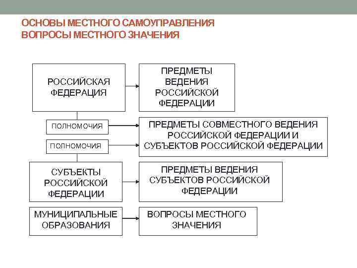 ОСНОВЫ МЕСТНОГО САМОУПРАВЛЕНИЯ ВОПРОСЫ МЕСТНОГО ЗНАЧЕНИЯ РОССИЙСКАЯ ФЕДЕРАЦИЯ ПОЛНОМОЧИЯ СУБЪЕКТЫ РОССИЙСКОЙ ФЕДЕРАЦИИ МУНИЦИПАЛЬНЫЕ ОБРАЗОВАНИЯ ПРЕДМЕТЫ ВЕДЕНИЯ РОССИЙСКОЙ ФЕДЕРАЦИИ ПРЕДМЕТЫ СОВМЕСТНОГО ВЕДЕНИЯ РОССИЙСКОЙ ФЕДЕРАЦИИ И СУБЪЕКТОВ РОССИЙСКОЙ ФЕДЕРАЦИИ ПРЕДМЕТЫ ВЕДЕНИЯ СУБЪЕКТОВ РОССИЙСКОЙ ФЕДЕРАЦИИ ВОПРОСЫ МЕСТНОГО ЗНАЧЕНИЯ