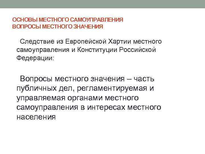 ОСНОВЫ МЕСТНОГО САМОУПРАВЛЕНИЯ ВОПРОСЫ МЕСТНОГО ЗНАЧЕНИЯ Следствие из Европейской Хартии местного самоуправления и Конституции Российской Федерации: Вопросы местного значения – часть публичных дел, регламентируемая и управляемая органами местного самоуправления в интересах местного населения